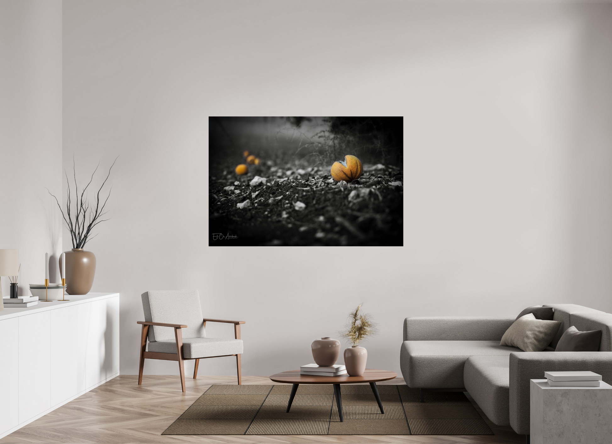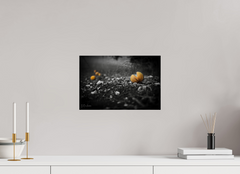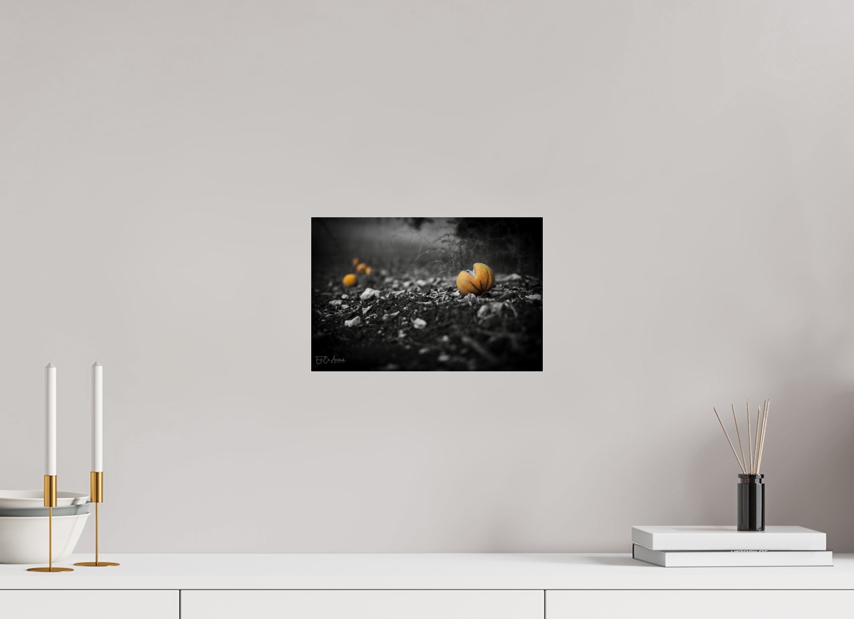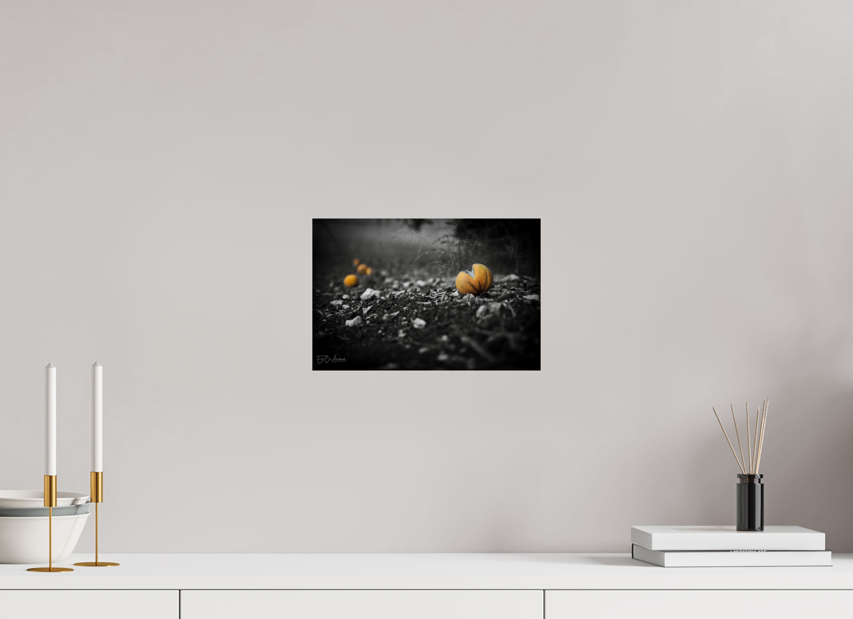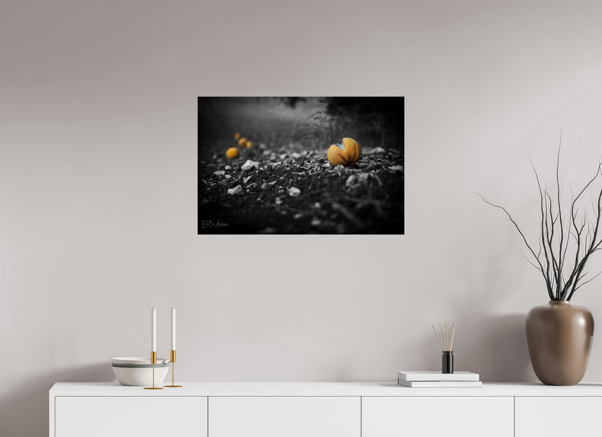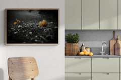 In this minimalist black-and-white composition, the familiar warmth of oranges is reimagined through light, shadow, and texture.